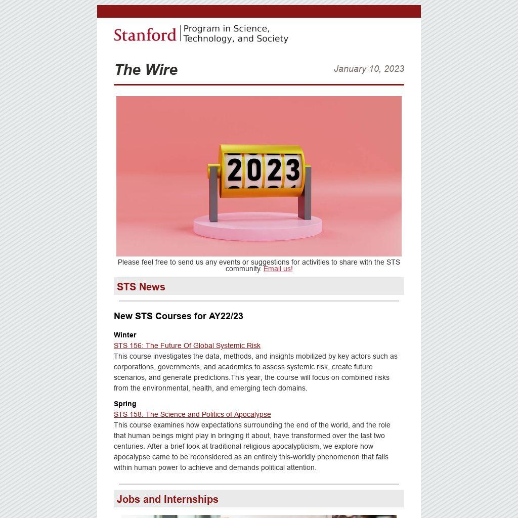 WinterSTS 156: The Future Of Global Systemic Risk This course investigates the data, methods, and insights mobilized by key actors such as corporations, governments, and academics to assess systemic risk, create future scenarios, and generate predictions.This year, the course will focus on combined risks from the environmental, health, and emerging tech domains.