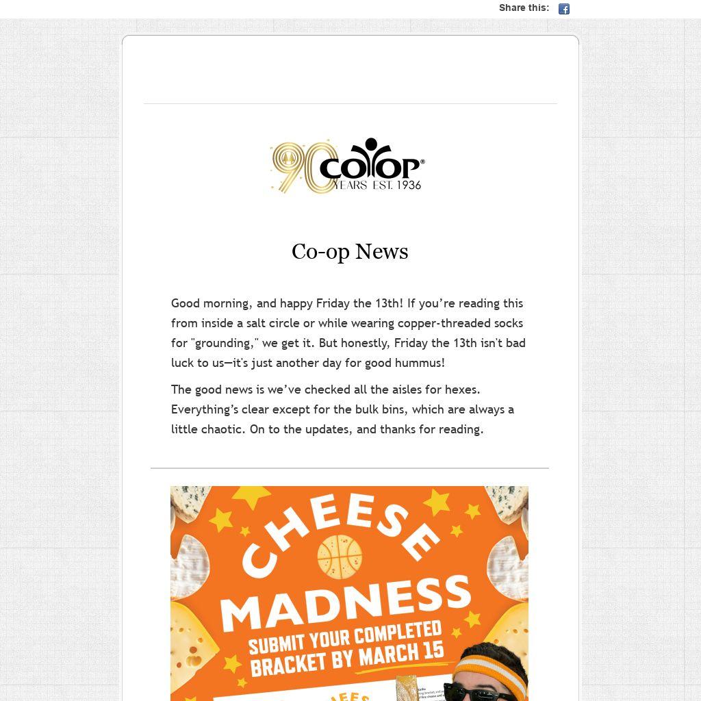 Et tu, Romaine? Celebrate the Ides of March on March 15 with a famous Co-op Caesar Salad. (Standard joke: We tried making a Brutus Salad once, but it was a little sharp. Waka waka.)
