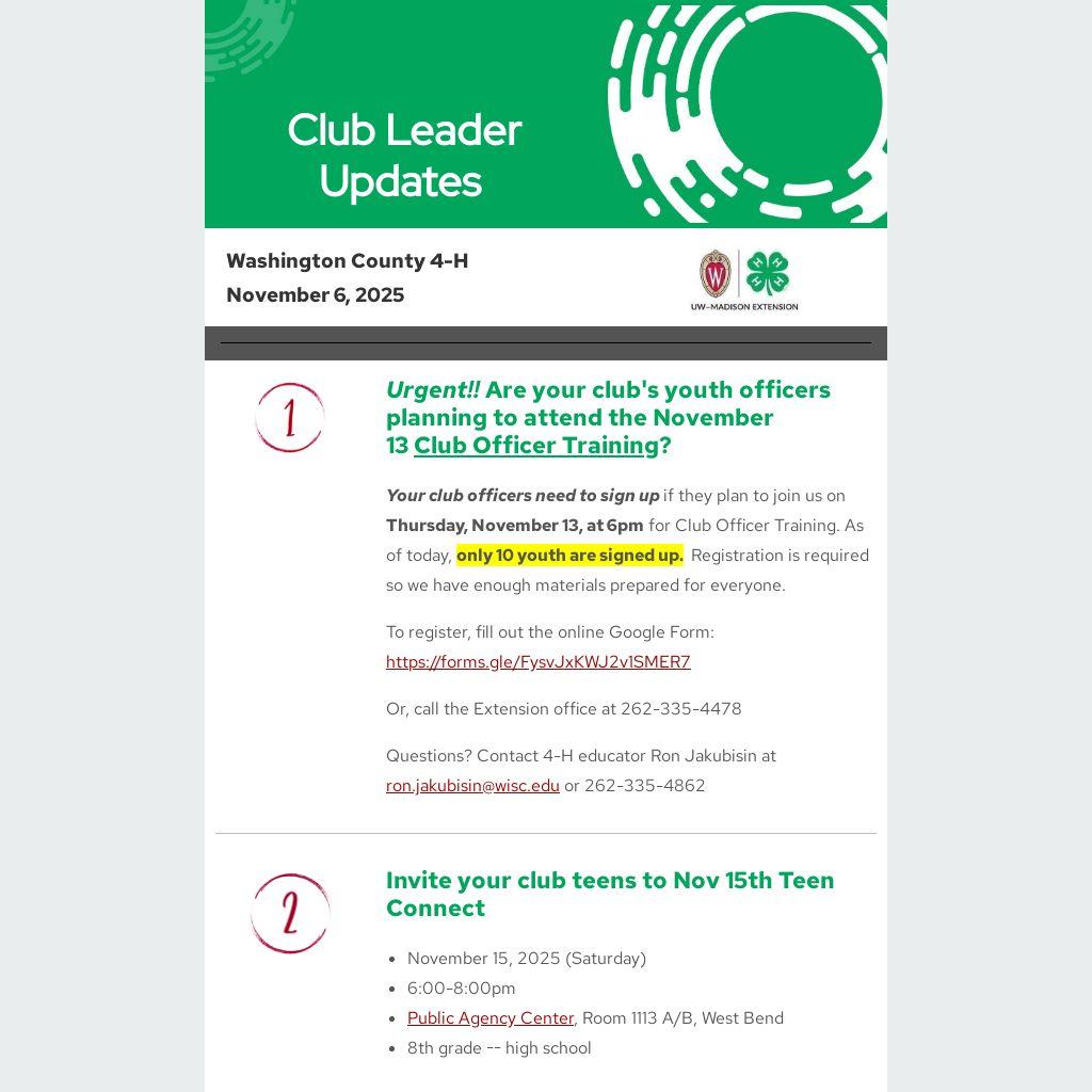 Questions? Contact 4-H educator Ron Jakubisin at ron.jakubisin@wisc.edu or 262-335-4862