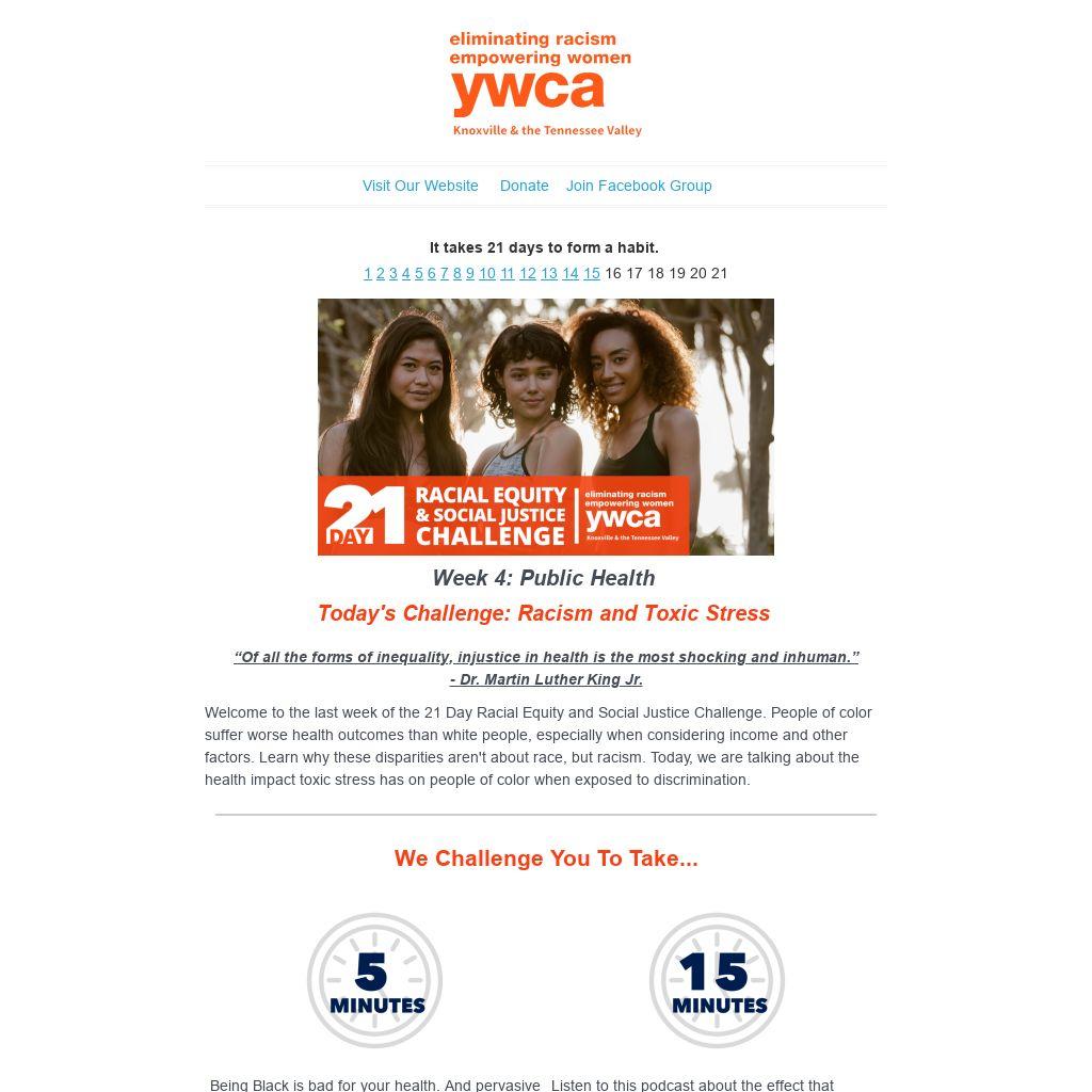 Welcome to the last week of the 21 Day Racial Equity and Social Justice Challenge. People of color suffer worse health outcomes than white people, especially when considering income and other factors. Learn why these disparities aren't about race, but racism. Today, we are talking about the health impact toxic stress has on people of color when exposed to discrimination.