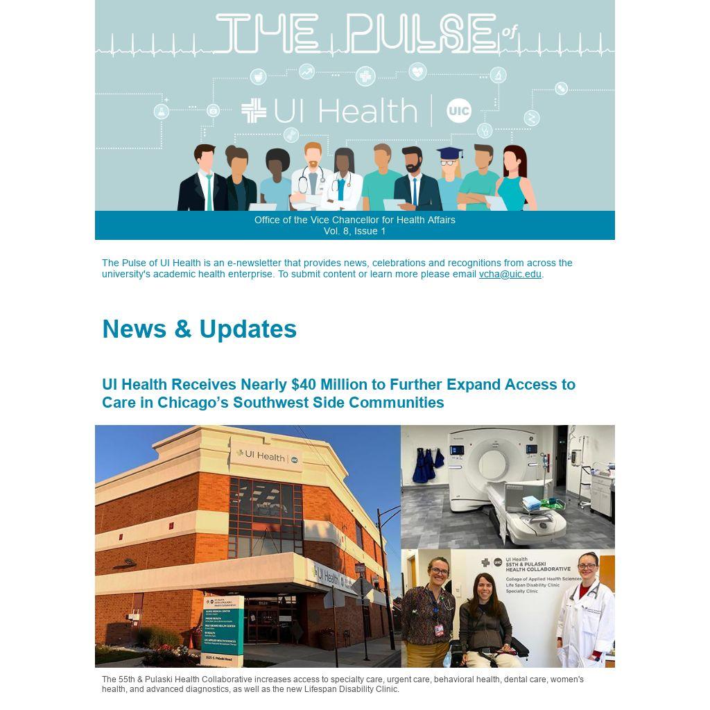 The Pulse of UI Health is an e-newsletter that provides news, celebrations and recognitions from across the university's academic health enterprise. To submit content or learn more please email vcha@uic.edu.