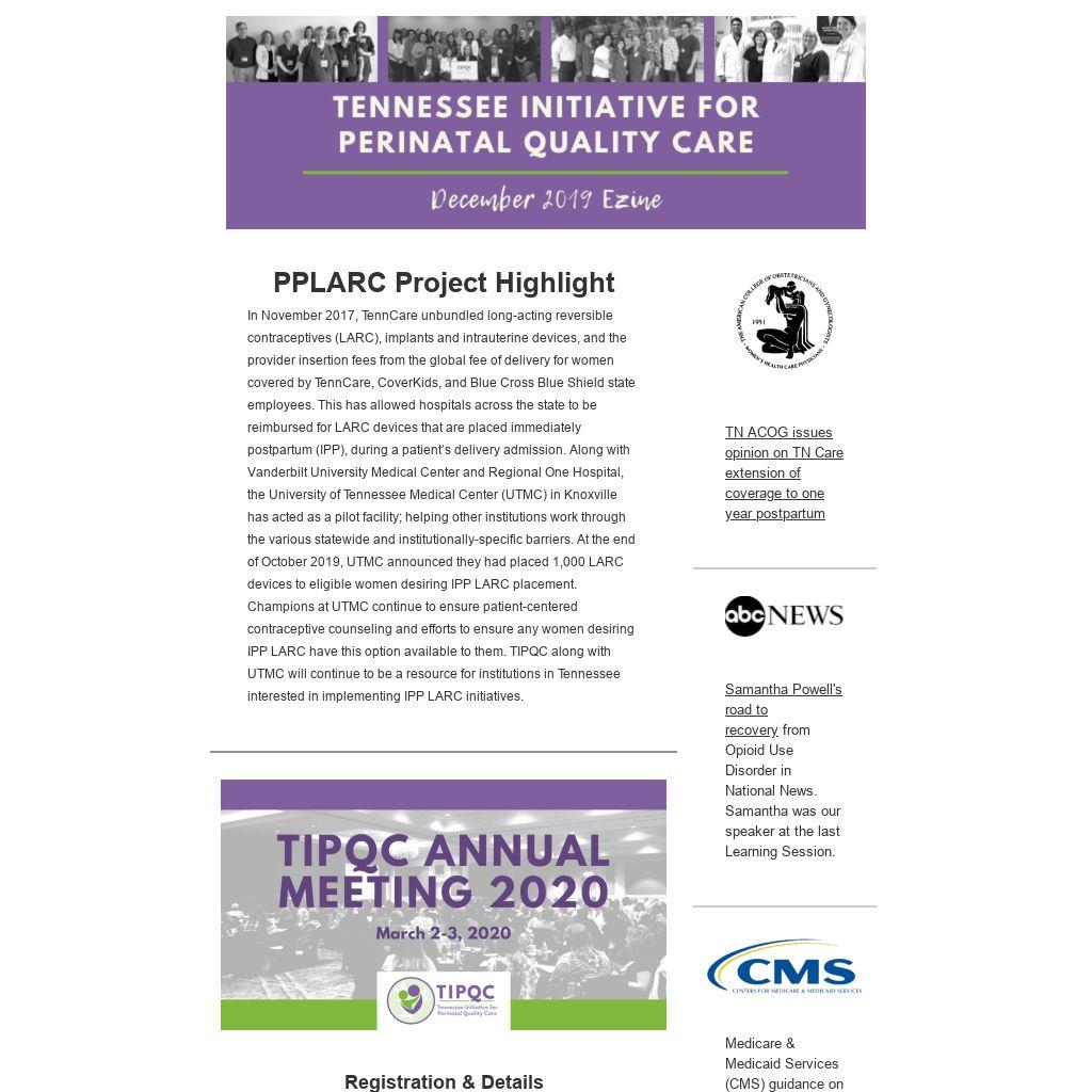 In November 2017, TennCare unbundled long-acting reversible contraceptives (LARC), implants and intrauterine devices, and the provider insertion fees from the global fee of delivery for women covered by TennCare, CoverKids, and Blue Cross Blue Shield state employees. This has allowed hospitals across the state to be reimbursed for LARC devices that are placed immediately postpartum (IPP), during a patient’s delivery admission. Along with Vanderbilt University Medical Center and Regional One Hospital, the University of Tennessee Medical Center (UTMC) in Knoxville has acted as a pilot facility; helping other institutions work through the various statewide and institutionally-specific barriers. At the end of October 2019, UTMC announced they had placed 1,000 LARC devices to eligible women desiring IPP LARC placement. Champions at UTMC continue to ensure patient-centered contraceptive counseling and efforts to ensure any women desiring IPP LARC have this option available to them. TIPQC along with UTMC will continue to be a resource for institutions in Tennessee interested in implementing IPP LARC initiatives.
