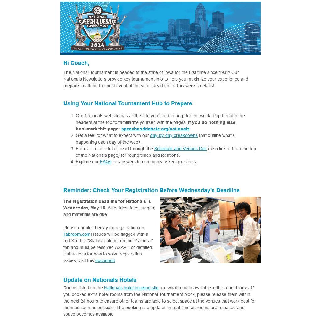 The National Tournament is headed to the state of Iowa for the first time since 1932! Our Nationals Newsletters provide key tournament info to help you maximize your experience and prepare to attend the best event of the year. Read on for this week's details!