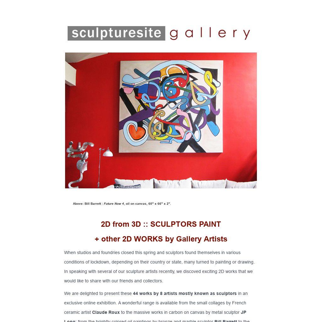 We are delighted to present these 44 works by 8 artists mostly known as sculptors in an exclusive online exhibition. A wonderful range is available from the small collages by French ceramic artist Claude Roux to the massive works in carbon on canvas by metal sculptor JP Long; from the brightly colored oil paintings by bronze and marble sculptor Bill Barrett to the quiet mixed media works by ceramic sculptor Nina Lyons; from the metal, glass, paper and pastel wall sculptures by celebrated metal sculptor Bella Feldman to the delicate watercolors on paper Underwater series by bronze figurative sculptor John Denning and from the fully abstract Jane Burton paintings (her ceramic work is definitely figurative) to ceramic sculptor Mark Chatterley's dreamy and intricate mixed media paintings of multiple figures.
