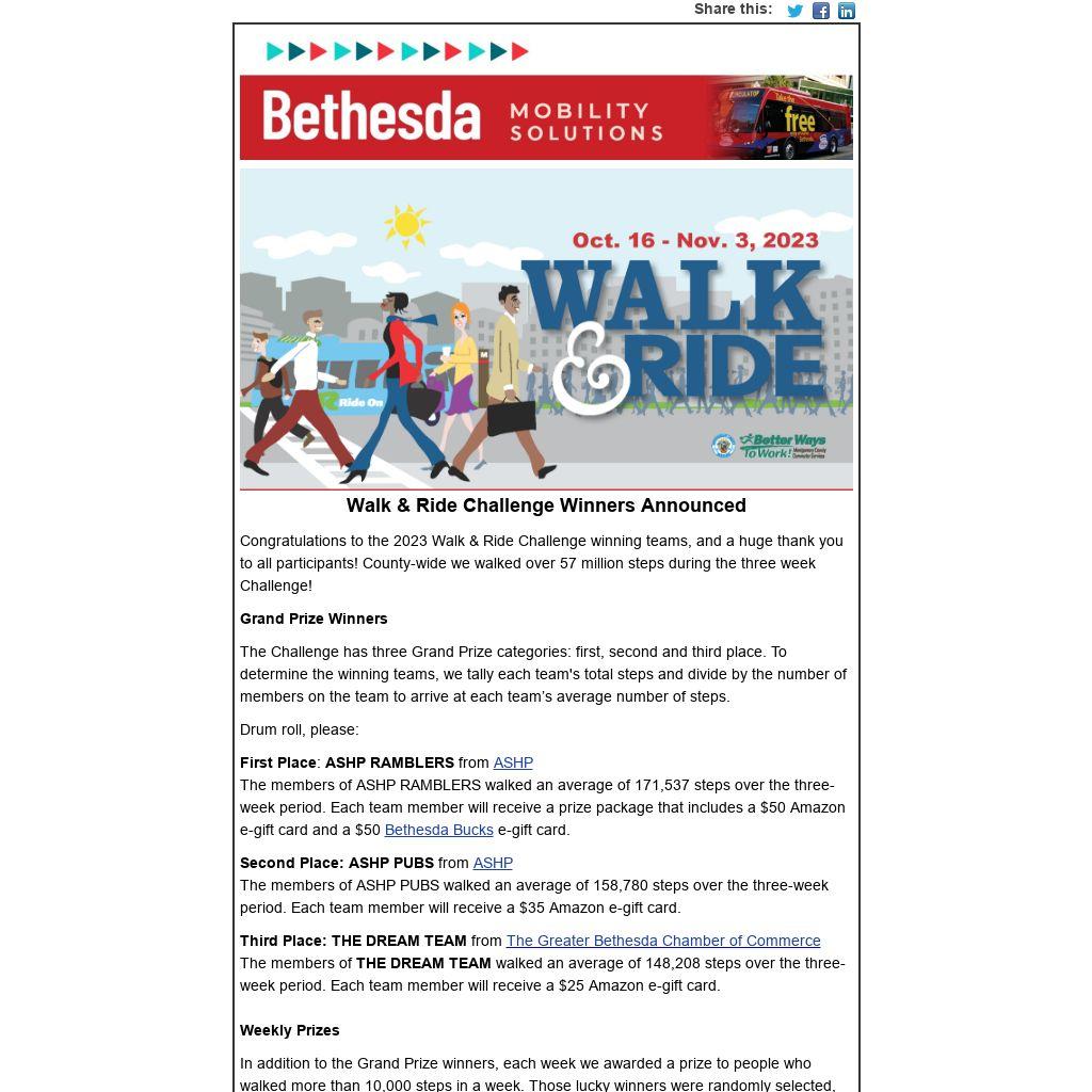 This year, we also had weekly challenges encouraging transportation options and informing participants about traveling in Bethesda. Congrats to all of the weekly winners!