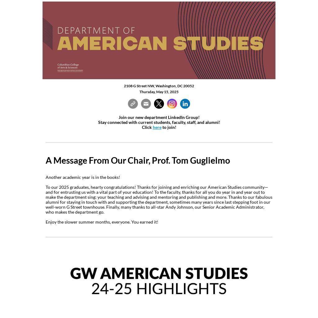 To our 2025 graduates, hearty congratulations! Thanks for joining and enriching our American Studies community—and for entrusting us with a vital part of your education! To the faculty, thanks for all you do year in and year out to make the department sing: your teaching and advising and mentoring and publishing and more. Thanks to our fabulous alumni for staying in touch with and supporting the department, sometimes many years since last stepping foot in our well-worn G Street townhouse. Finally, many thanks to all-star Andy Johnson, our Senior Academic Administrator, who makes the department go.