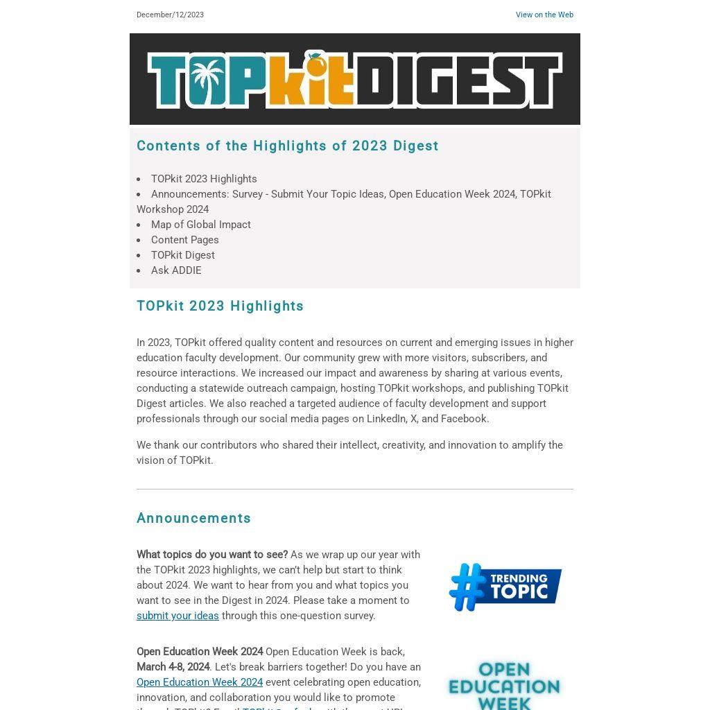 What topics do you want to see? As we wrap up our year with the TOPkit 2023 highlights, we can’t help but start to think about 2024. We want to hear from you and what topics you want to see in the Digest in 2024. Please take a moment to submit your ideas through this one-question survey.