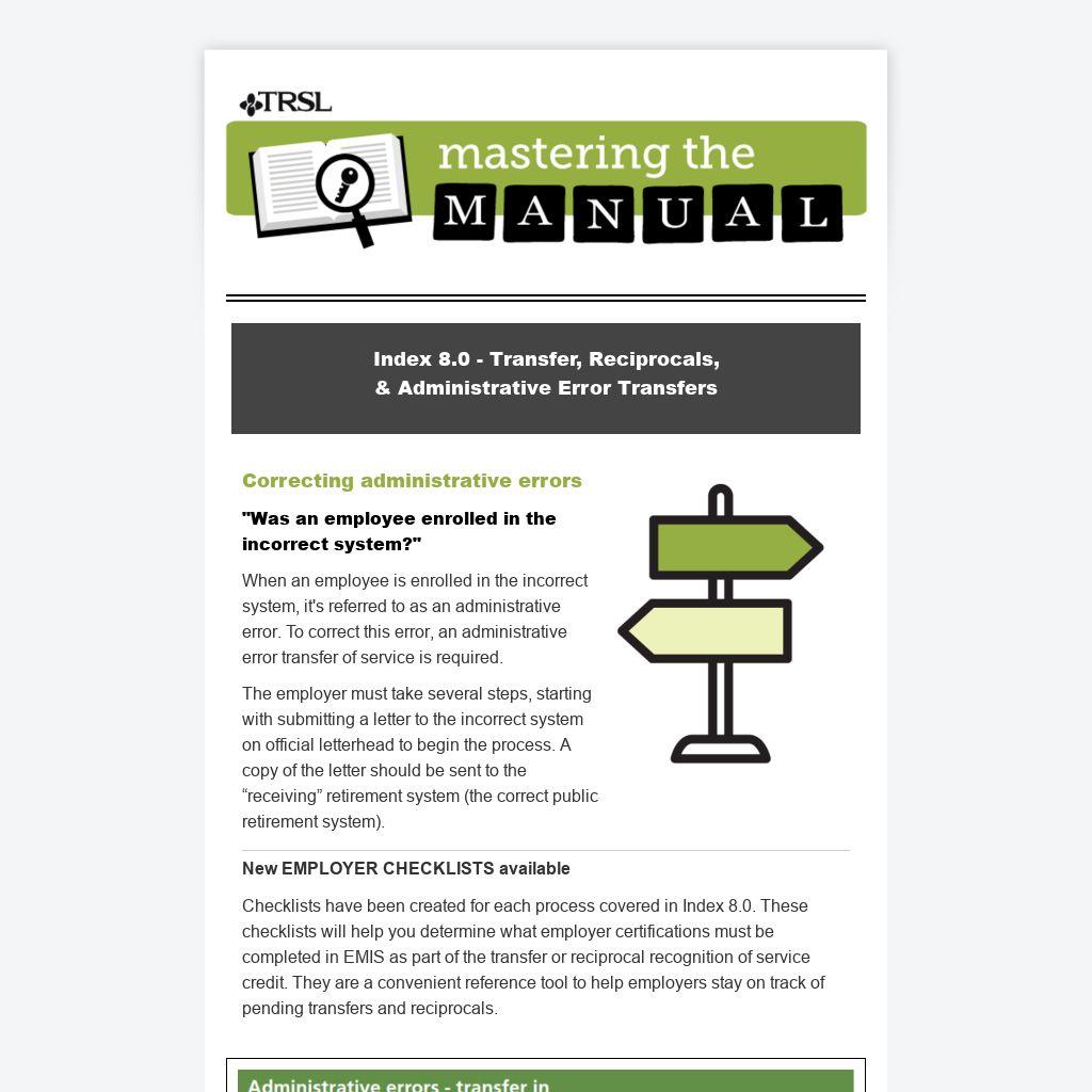 Checklists have been created for each process covered in Index 8.0. These checklists will help you determine what employer certifications must be completed in EMIS as part of the transfer or reciprocal recognition of service credit. They are a convenient reference tool to help employers stay on track of pending transfers and reciprocals.