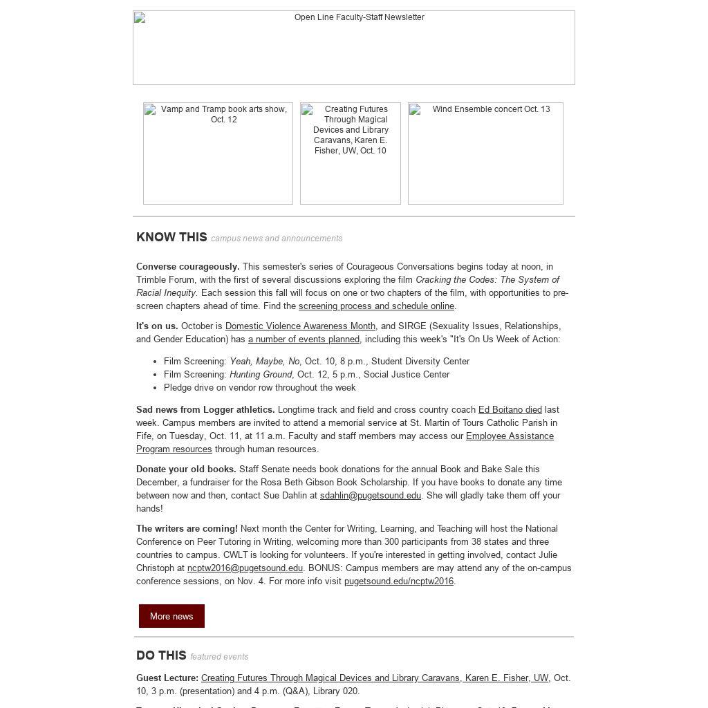 Sad news from Logger athletics. Longtime track and field and cross country coach Ed Boitano died last week. Campus members are invited to attend a memorial service at St. Martin of Tours Catholic Parish in Fife, on Tuesday, Oct. 11, at 11 a.m. Faculty and staff members may access our Employee Assistance Program resources through human resources. Donate your old books. Staff Senate needs book donations for the annual Book and Bake Sale this December, a fundraiser for the Rosa Beth Gibson Book Scholarship. If you have books to donate any time between now and then, contact Sue Dahlin at sdahlin@pugetsound.edu. She will gladly take them off your hands! The writers are coming! Next month the Center for Writing, Learning, and Teaching will host the National Conference on Peer Tutoring in Writing, welcoming more than 300 participants from 38 states and three countries to campus. CWLT is looking for volunteers. If you're interested in getting involved, contact Julie Christoph at ncptw2016@pugetsound.edu. BONUS: Campus members are may attend any of the on-campus conference sessions, on Nov. 4. For more info visit pugetsound.edu/ncptw2016.