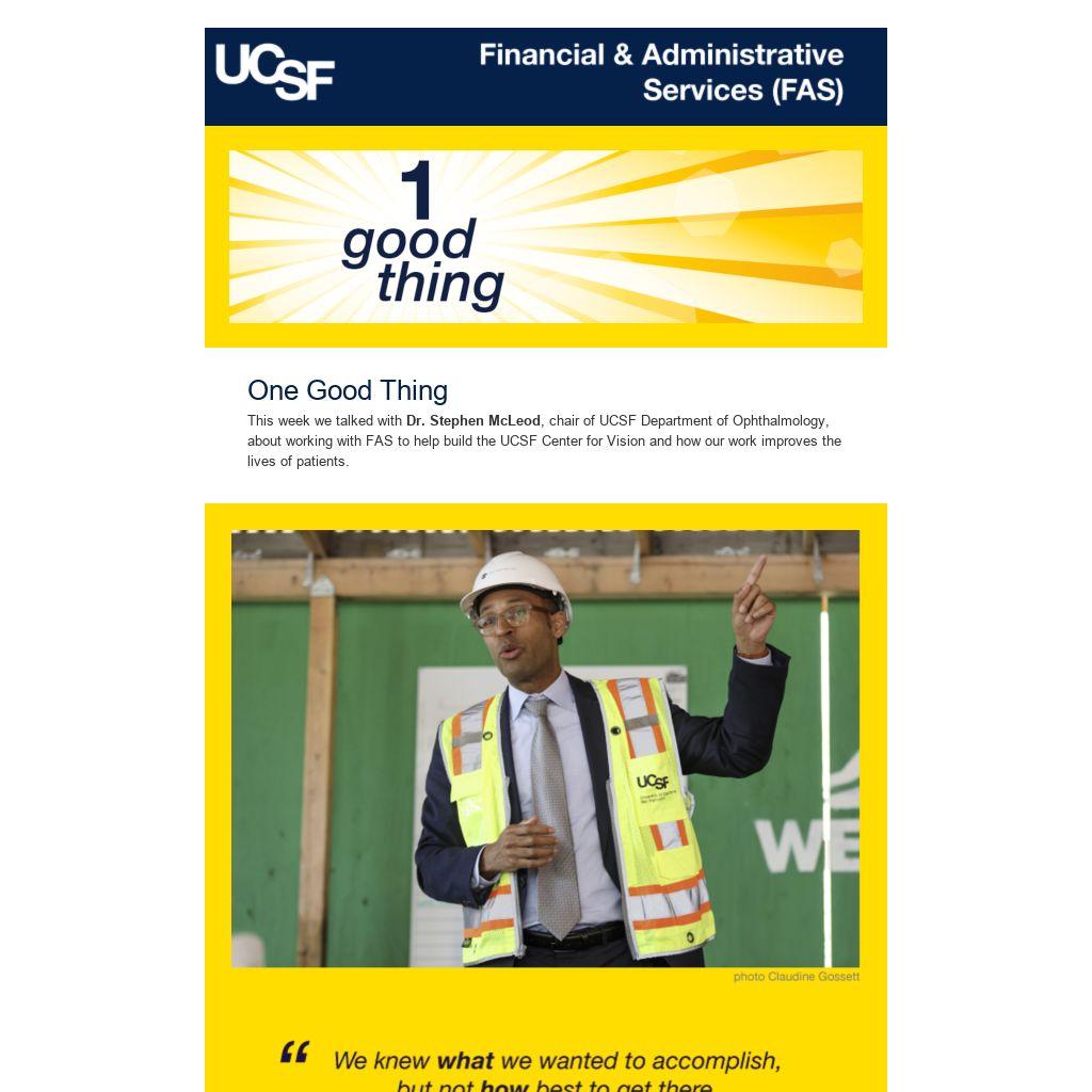 Center for Vision on Block 33, opening later this year in Mission Bay. Dr. McLeod describes one of many benefits of the unification, using an example of the current treatment trips for a 30-year old man with chronic eye conditions: