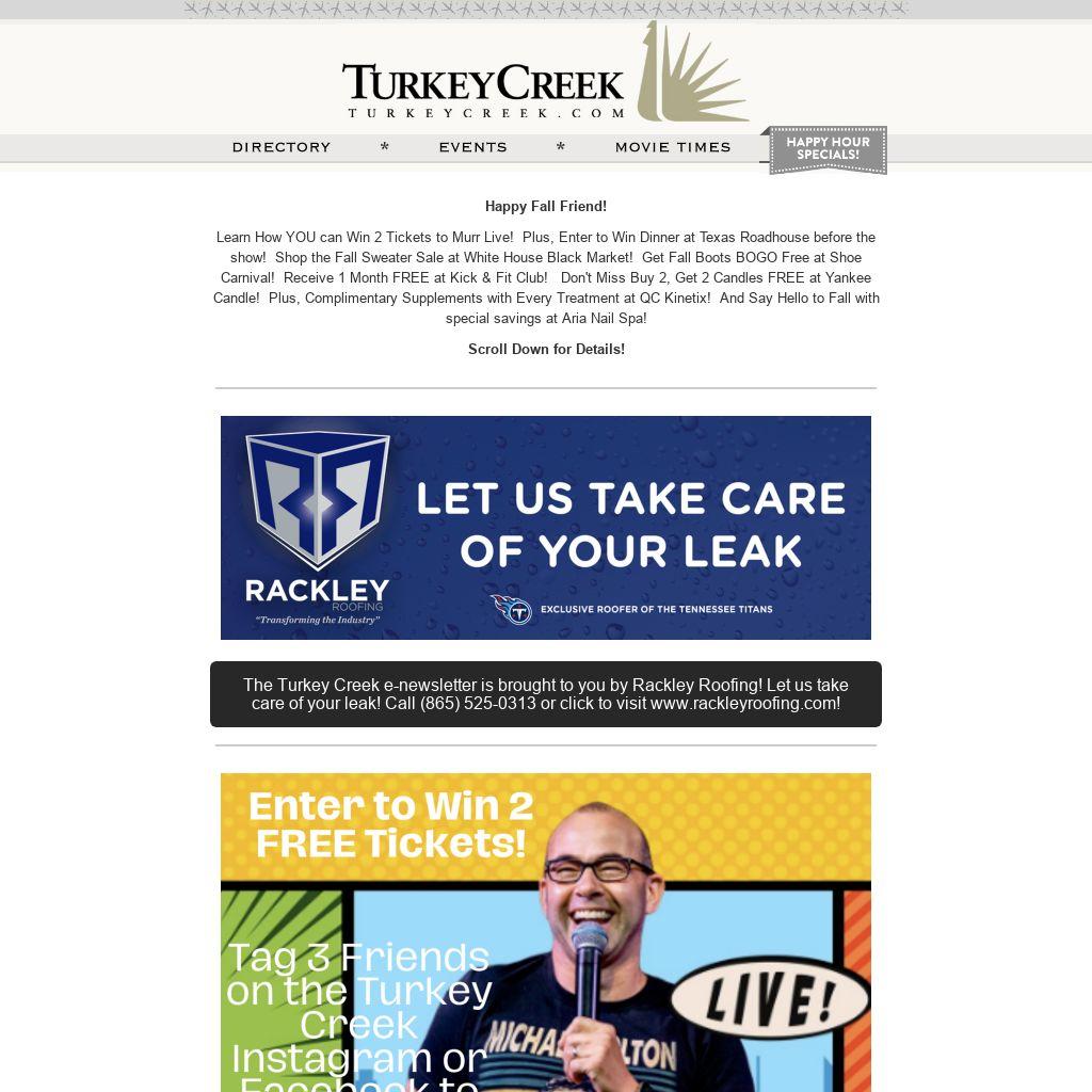 Learn How YOU can Win 2 Tickets to Murr Live! Plus, Enter to Win Dinner at Texas Roadhouse before the show! Shop the Fall Sweater Sale at White House Black Market! Get Fall Boots BOGO Free at Shoe Carnival! Receive 1 Month FREE at Kick & Fit Club! Don't Miss Buy 2, Get 2 Candles FREE at Yankee Candle! Plus, Complimentary Supplements with Every Treatment at QC Kinetix! And Say Hello to Fall with special savings at Aria Nail Spa!