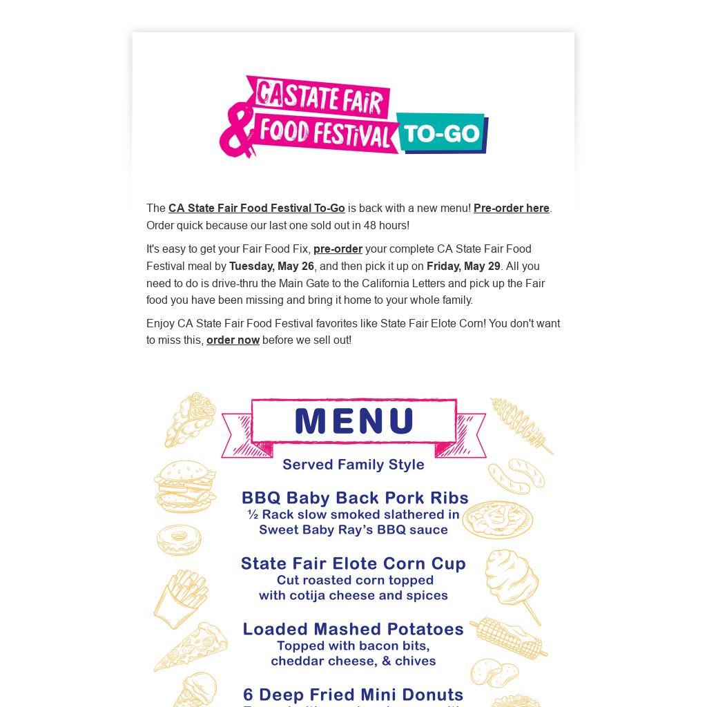 It's easy to get your Fair Food Fix, pre-order your complete CA State Fair Food Festival meal by Tuesday, May 26, and then pick it up on Friday, May 29. All you need to do is drive-thru the Main Gate to the California Letters and pick up the Fair food you have been missing and bring it home to your whole family.