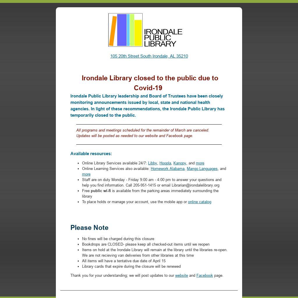Irondale Public Library leadership and Board of Trustees have been closely monitoring announcements issued by local, state and national health agencies. In light of these recommendations, the Irondale Public Library has temporarily closed to the public.