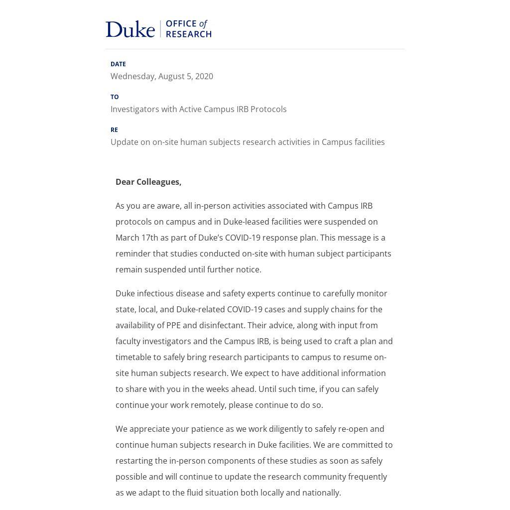 Duke infectious disease and safety experts continue to carefully monitor state, local, and Duke-related COVID-19 cases and supply chains for the availability of PPE and disinfectant. Their advice, along with input from faculty investigators and the Campus IRB, is being used to craft a plan and timetable to safely bring research participants to campus to resume on-site human subjects research. We expect to have additional information to share with you in the weeks ahead. Until such time, if you can safely continue your work remotely, please continue to do so.