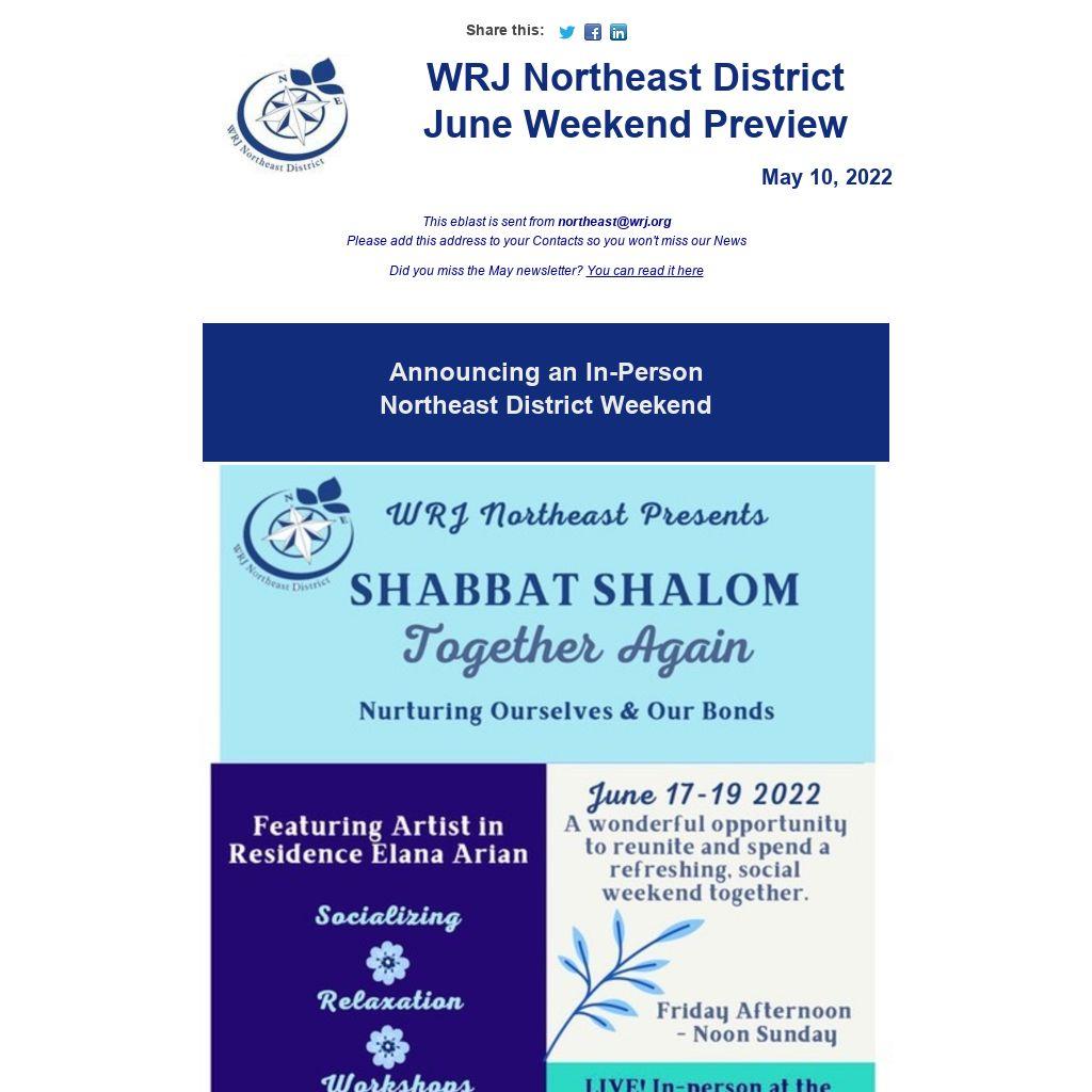 Social Action. As is our custom at Northeast District weekends, we will have a social action project. We will ask participants to bring a variety of items for collection, to benefit an Albany area organization. The list of items to be collected is in formation and will be sent to registrants in advance of the weekend.