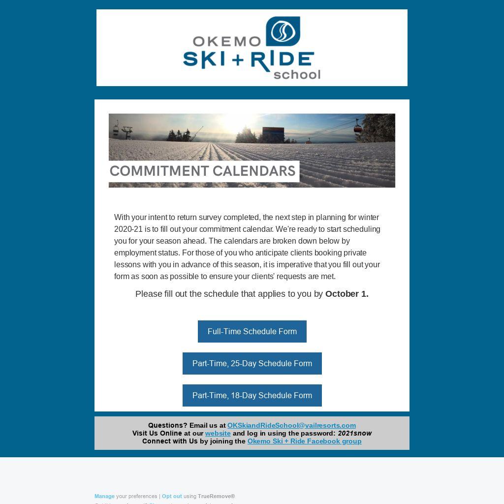 With your intent to return survey completed, the next step in planning for winter 2020-21 is to fill out your commitment calendar. We're ready to start scheduling you for your season ahead. The calendars are broken down below by employment status. For those of you who anticipate clients booking private lessons with you in advance of this season, it is imperative that you fill out your form as soon as possible to ensure your clients' requests are met.