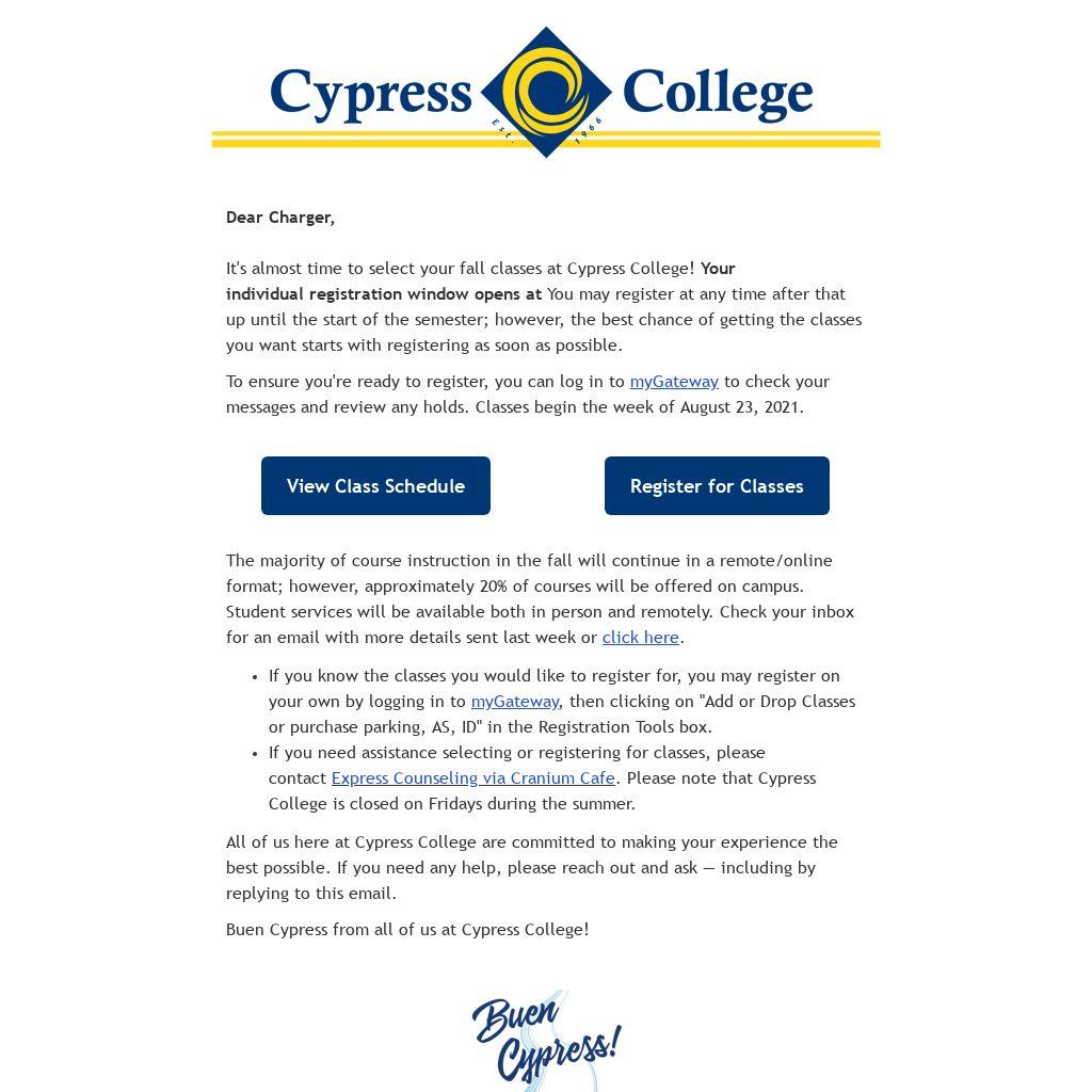 It's almost time to select your fall classes at Cypress College! Your individual registration window opens at You may register at any time after that up until the start of the semester; however, the best chance of getting the classes you want starts with registering as soon as possible.