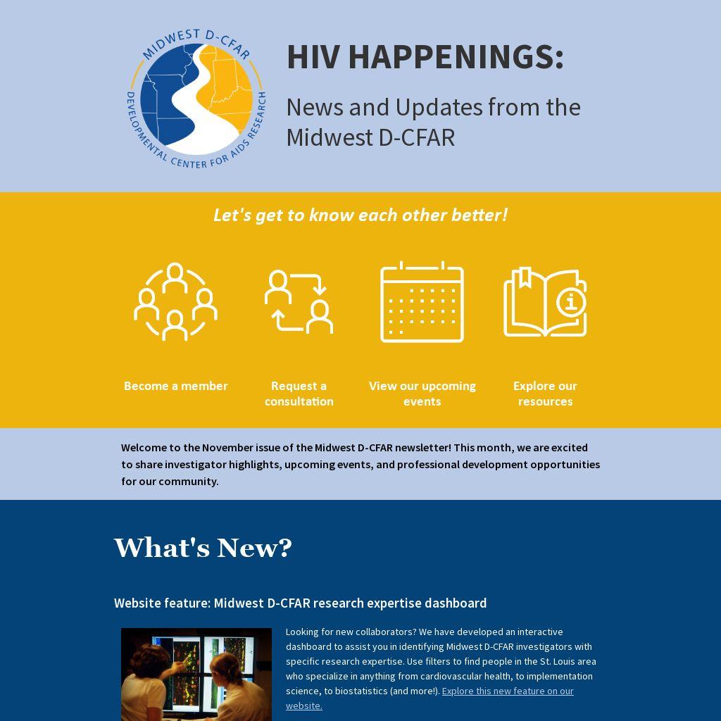 Welcome to the November issue of the Midwest D-CFAR newsletter! This month, we are excited to share investigator highlights, upcoming events, and professional development opportunities for our community.