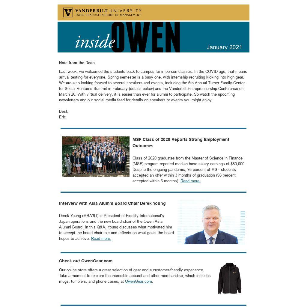 At Owen, we’re known for world-class education with personal scale — and that extends to your experience as alumni as well. We’re thrilled to introduce the new Owen Volunteer Community, which replaces the former Owen Alumni Council. The Owen Volunteer Community is an opportunity to stay in touch with your classmates while serving Owen in one of 2 new volunteer roles: Class Agent and Class Secretary.