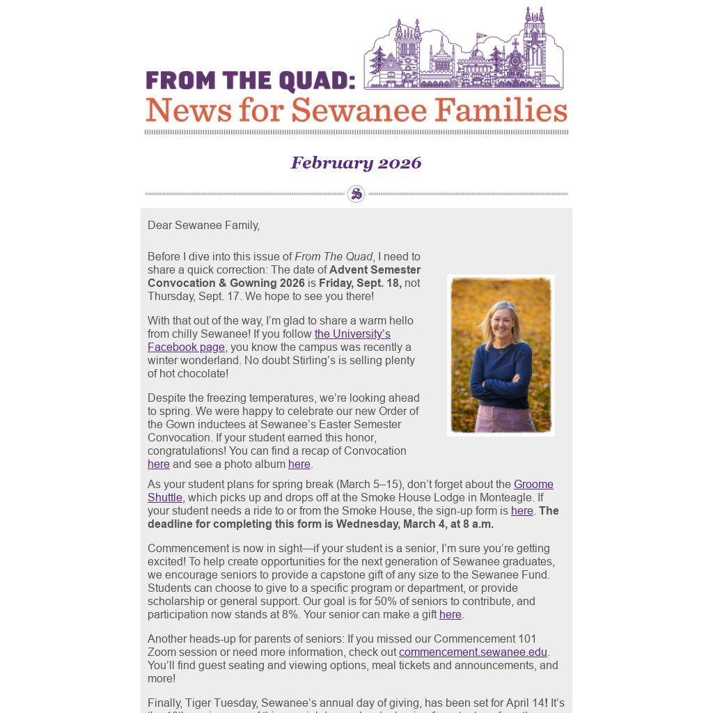 As always, please don’t hesitate to get in touch with me at sewaneeparents@sewanee.edu. Stay warm!