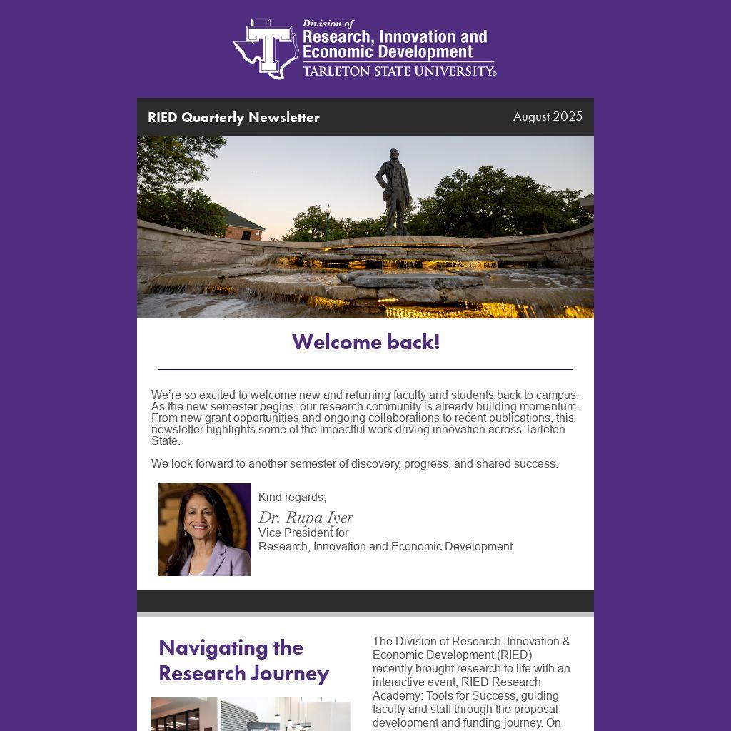 We’re so excited to welcome new and returning faculty and students back to campus. As the new semester begins, our research community is already building momentum. From new grant opportunities and ongoing collaborations to recent publications, this newsletter highlights some of the impactful work driving innovation across Tarleton State.