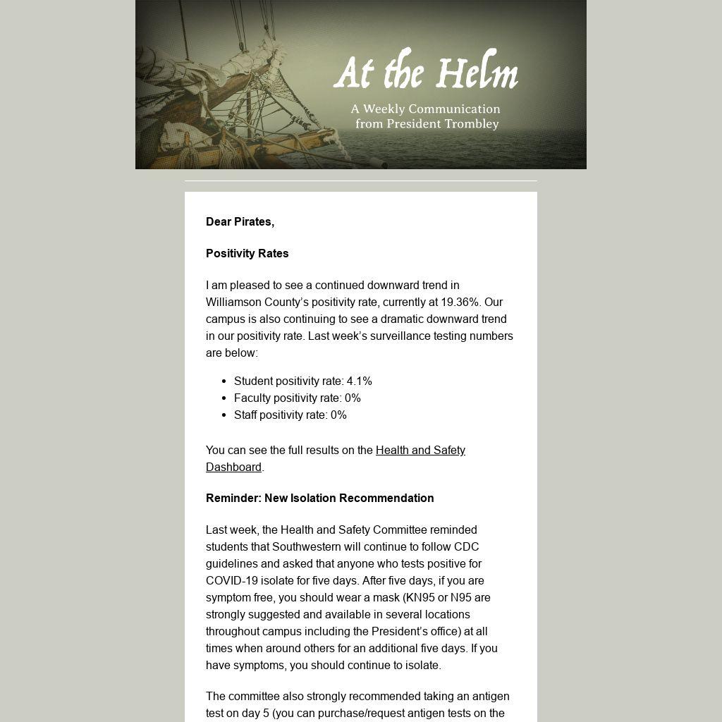 Last week, the Health and Safety Committee reminded students that Southwestern will continue to follow CDC guidelines and asked that anyone who tests positive for COVID-19 isolate for five days. After five days, if you are symptom free, you should wear a mask (KN95 or N95 are strongly suggested and available in several locations throughout campus including the President’s office) at all times when around others for an additional five days. If you have symptoms, you should continue to isolate.