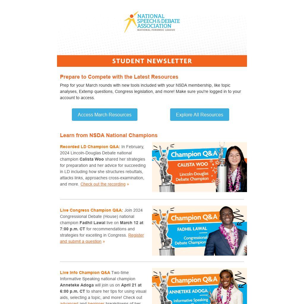Prep for your March rounds with new tools included with your NSDA membership, like topic analyses, Extemp questions, Congress legislation, and more! Make sure you're logged in to your account to access.