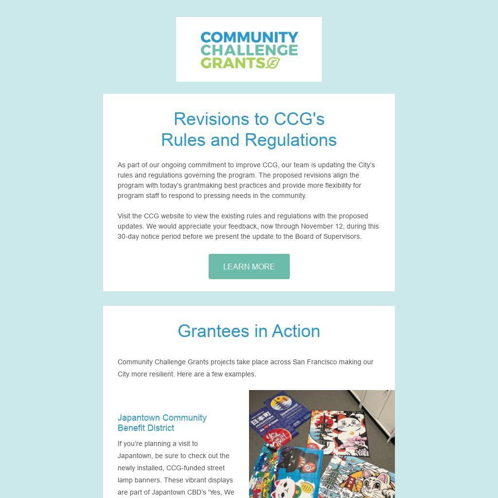 As part of our ongoing commitment to improve CCG, our team is updating the City’s rules and regulations governing the program. The proposed revisions align the program with today’s grantmaking best practices and provide more flexibility for program staff to respond to pressing needs in the community.