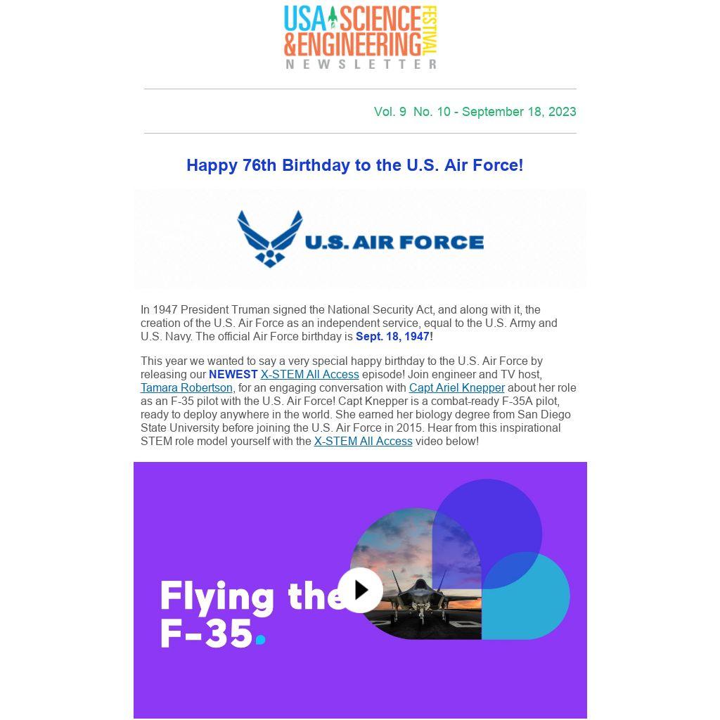 This year we wanted to say a very special happy birthday to the U.S. Air Force by releasing our NEWEST X-STEM All Access episode! Join engineer and TV host, Tamara Robertson, for an engaging conversation with Capt Ariel Knepper about her role as an F-35 pilot with the U.S. Air Force! Capt Knepper is a combat-ready F-35A pilot, ready to deploy anywhere in the world. She earned her biology degree from San Diego State University before joining the U.S. Air Force in 2015. Hear from this inspirational STEM role model yourself with the X-STEM All Access video below!