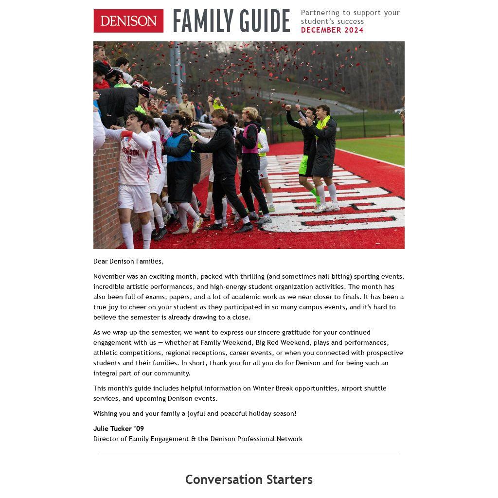 This month's guide includes helpful information on Winter Break opportunities, airport shuttle services, and upcoming Denison events.