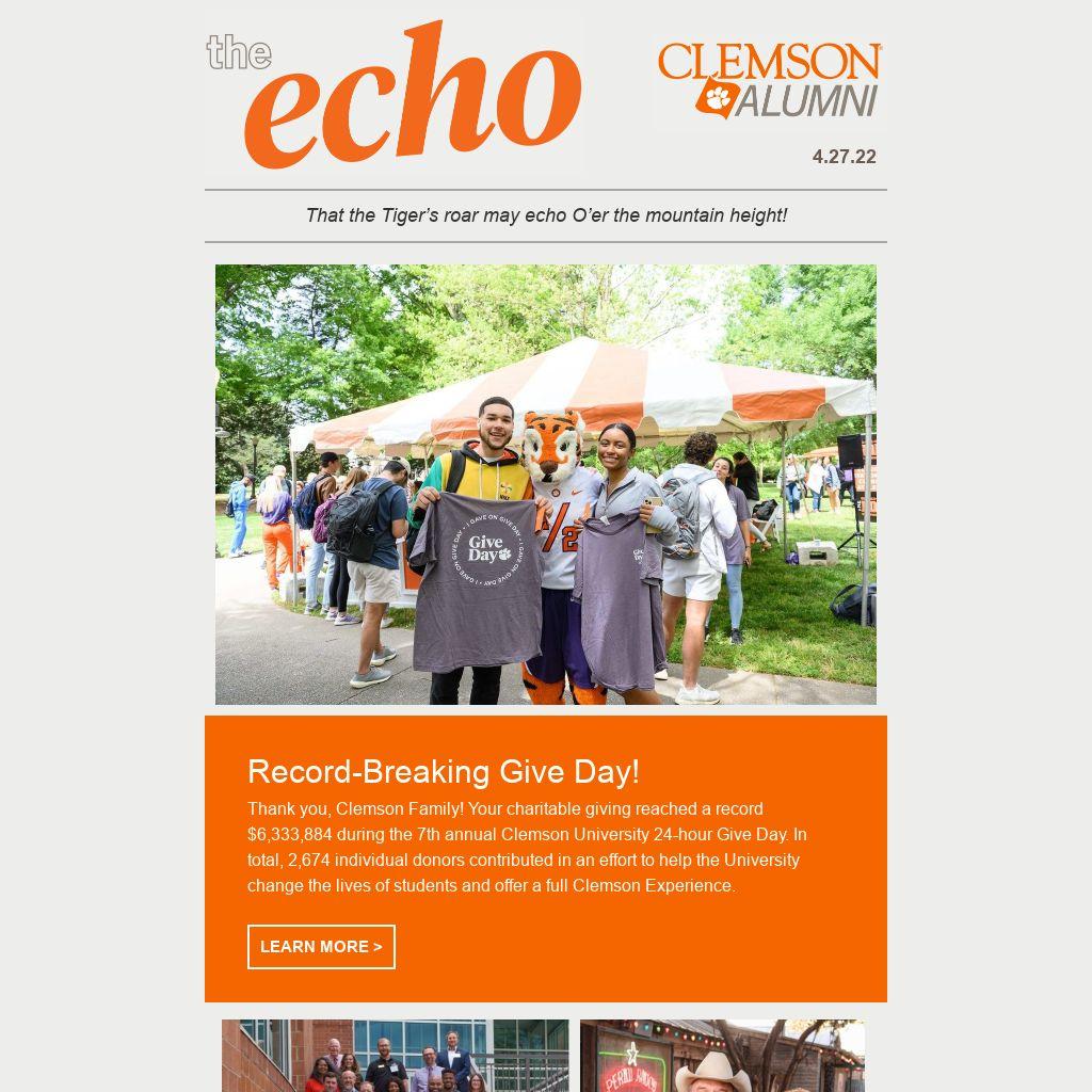 Thank you, Clemson Family! Your charitable giving reached a record $6,333,884 during the 7th annual Clemson University 24-hour Give Day. In total, 2,674 individual donors contributed in an effort to help the University change the lives of students and offer a full Clemson Experience.