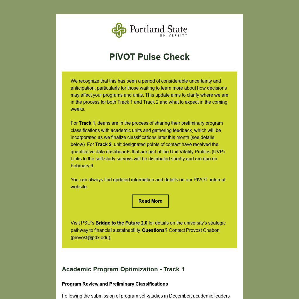 The provost continues to provide regular updates on progress at the bi-weekly Faculty Senate Budget Committee meetings, the President’s Executive Council, as well as with the full Faculty Senate.