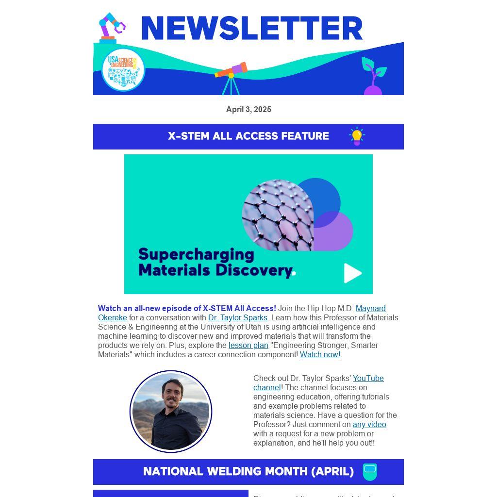 Watch an all-new episode of X-STEM All Access! Join the Hip Hop M.D. Maynard Okereke for a conversation with Dr. Taylor Sparks. Learn how this Professor of Materials Science & Engineering at the University of Utah is using artificial intelligence and machine learning to discover new and improved materials that will transform the products we rely on. Plus, explore the lesson plan "Engineering Stronger, Smarter Materials" which includes a career connection component! Watch now!