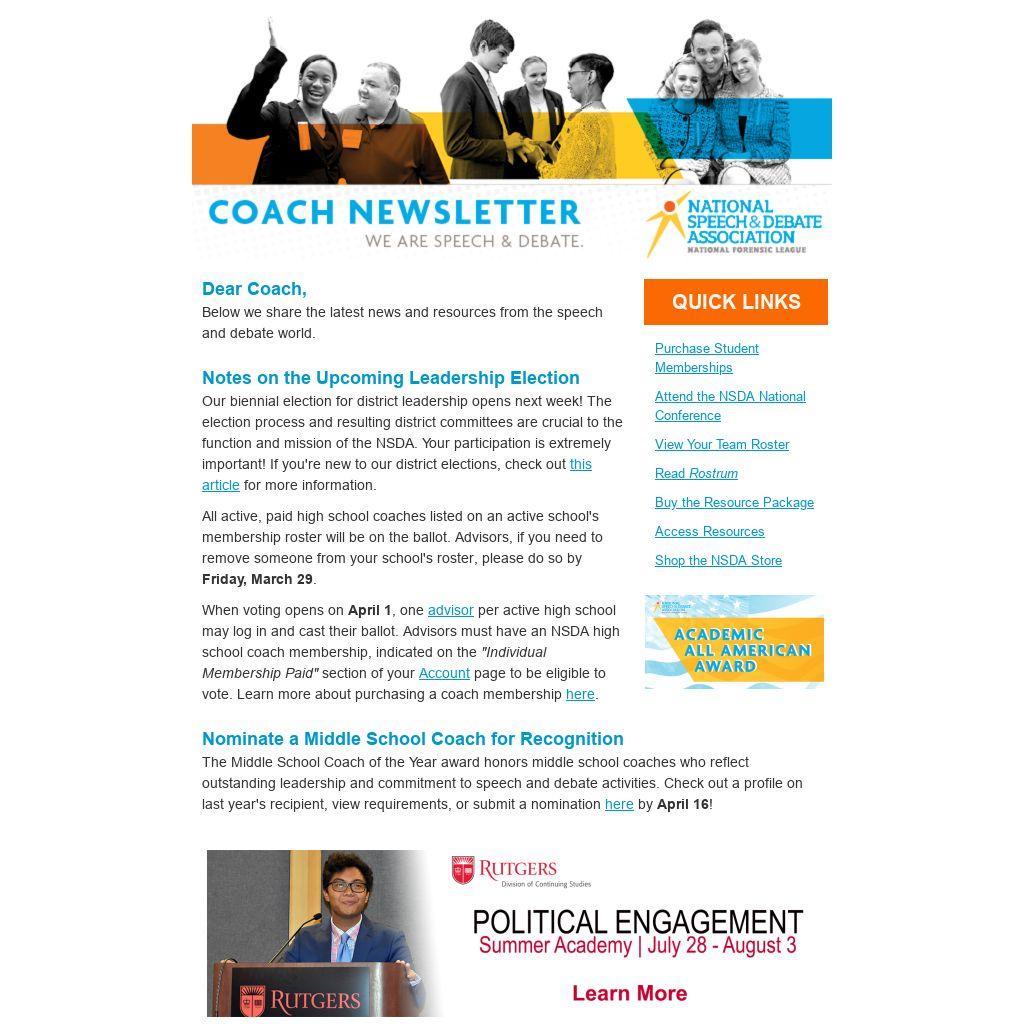 Our biennial election for district leadership opens next week! The election process and resulting district committees are crucial to the function and mission of the NSDA. Your participation is extremely important! If you're new to our district elections, check out this article for more information. All active, paid high school coaches listed on an active school's membership roster will be on the ballot. Advisors, if you need to remove someone from your school's roster, please do so by Friday, March 29.