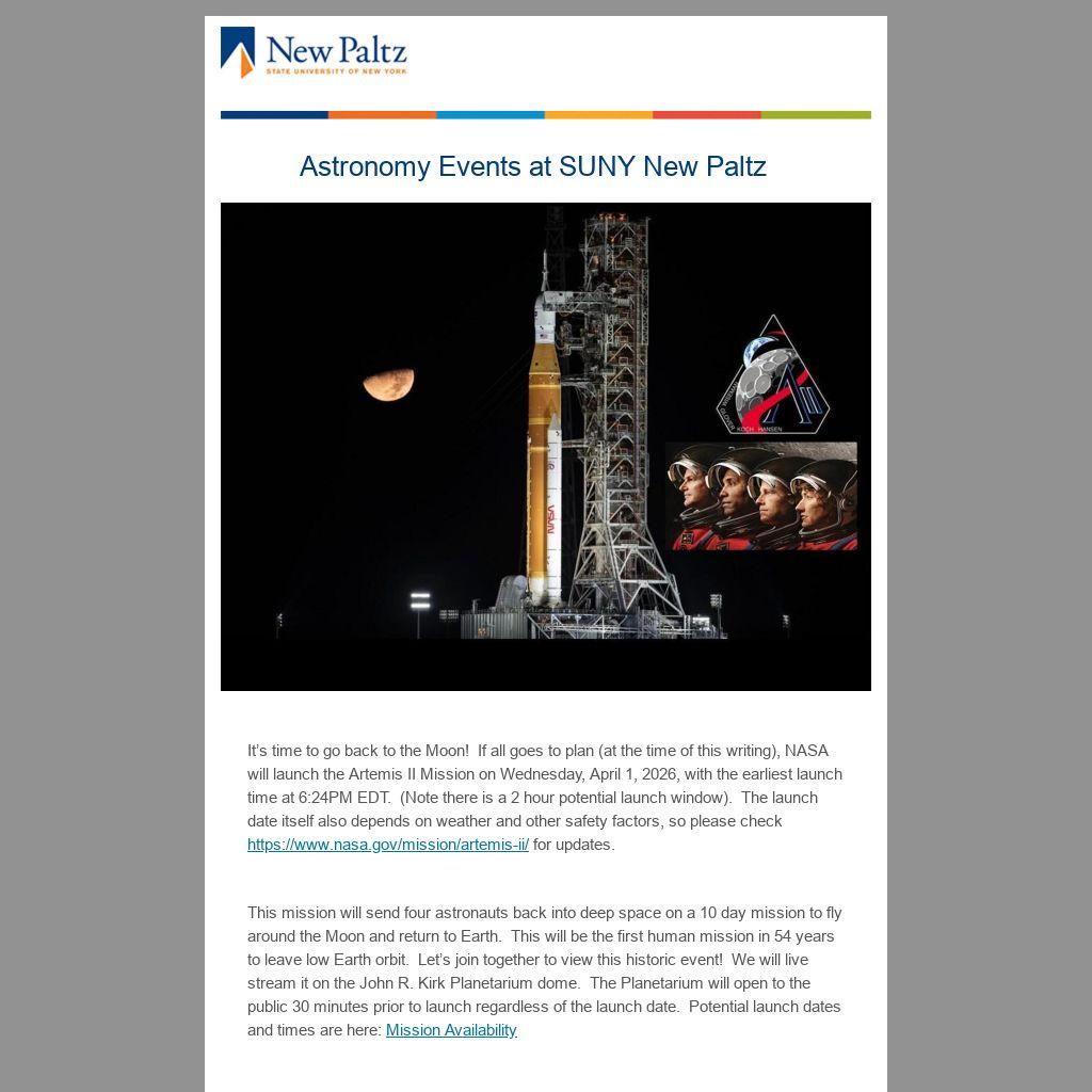 It’s time to go back to the Moon! If all goes to plan (at the time of this writing), NASA will launch the Artemis II Mission on Wednesday, April 1, 2026, with the earliest launch time at 6:24PM EDT. (Note there is a 2 hour potential launch window). The launch date itself also depends on weather and other safety factors, so please check https://www.nasa.gov/mission/artemis-ii/ for updates.