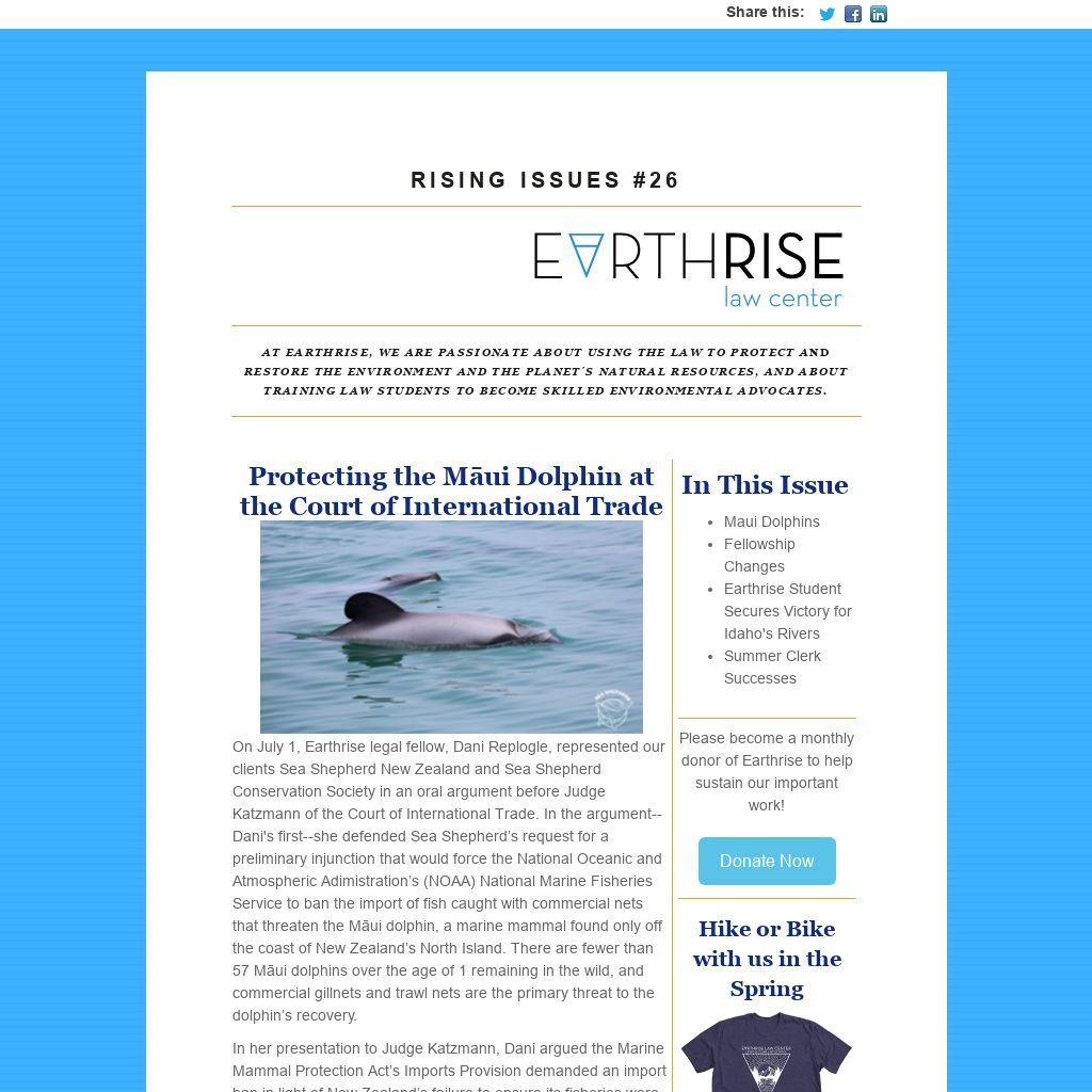 | On July 1, Earthrise legal fellow, Dani Replogle, represented our clients Sea Shepherd New Zealand and Sea Shepherd Conservation Society in an oral argument before Judge Katzmann of the Court of International Trade. In the argument--Dani's first--she defended Sea Shepherd’s request for a preliminary injunction that would force the National Oceanic and Atmospheric Adimistration’s (NOAA) National Marine Fisheries Service to ban the import of fish caught with commercial nets that threaten the Māui dolphin, a marine mammal found only off the coast of New Zealand’s North Island. There are fewer than 57 Māui dolphins over the age of 1 remaining in the wild, and commercial gillnets and trawl nets are the primary threat to the dolphin’s recovery.