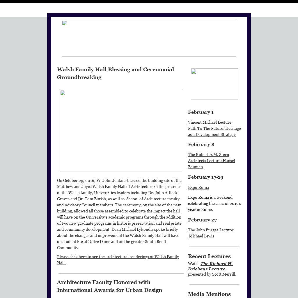 On October 29, 2016, Fr. John Jenkins blessed the building site of the Matthew and Joyce Walsh Family Hall of Architecture in the presence of the Walsh family, Universities leaders including Dr. John Affleck-Graves and Dr. Tom Burish, as well as School of Architecture faculty and Advisory Council members. The ceremony, on the site of the new building, allowed all those assembled to celebrate the impact the hall will have on the University’s academic programs through the addition of two new graduate programs in historic preservation and real estate and community development. Dean Michael Lykoudis spoke briefly about the changes and improvement the Walsh Family Hall will have on student life at Notre Dame and on the greater South Bend Community.