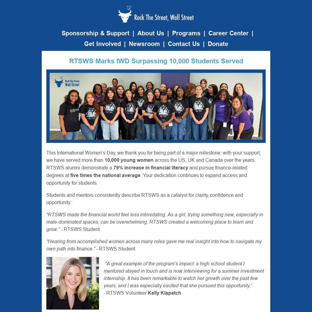 This International Women’s Day, we thank you for being part of a major milestone: with your support, we have served more than 10,000 young women across the US, UK and Canada over the years. RTSWS alumni demonstrate a 79% increase in financial literacy and pursue finance-related degrees at five times the national average. Your dedication continues to expand access and opportunity for students.