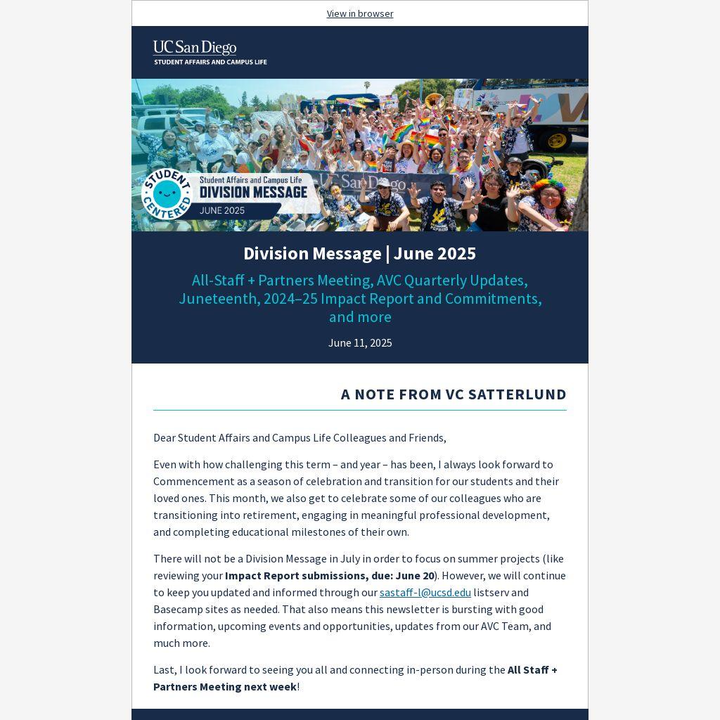 There will not be a Division Message in July in order to focus on summer projects (like reviewing your Impact Report submissions, due: June 20). However, we will continue to keep you updated and informed through our sastaff-l@ucsd.edu listserv and Basecamp sites as needed. That also means this newsletter is bursting with good information, upcoming events and opportunities, updates from our AVC Team, and much more.