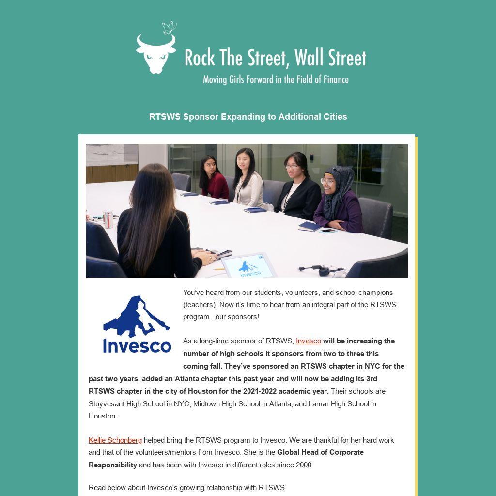 As a long-time sponsor of RTSWS, Invesco will be increasing the number of high schools it sponsors from two to three this coming fall. They’ve sponsored an RTSWS chapter in NYC for the past two years, added an Atlanta chapter this past year and will now be adding its 3rd RTSWS chapter in the city of Houston for the 2021-2022 academic year. Their schools are Stuyvesant High School in NYC, Midtown High School in Atlanta, and Lamar High School in Houston.