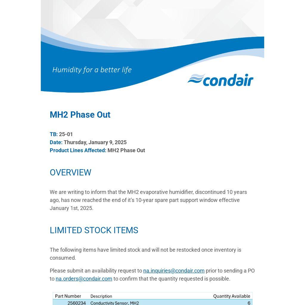 We are writing to inform that the MH2 evaporative humidifier, discontinued 10 years ago, has now reached the end of it’s 10-year spare part support window effective January 1st, 2025.