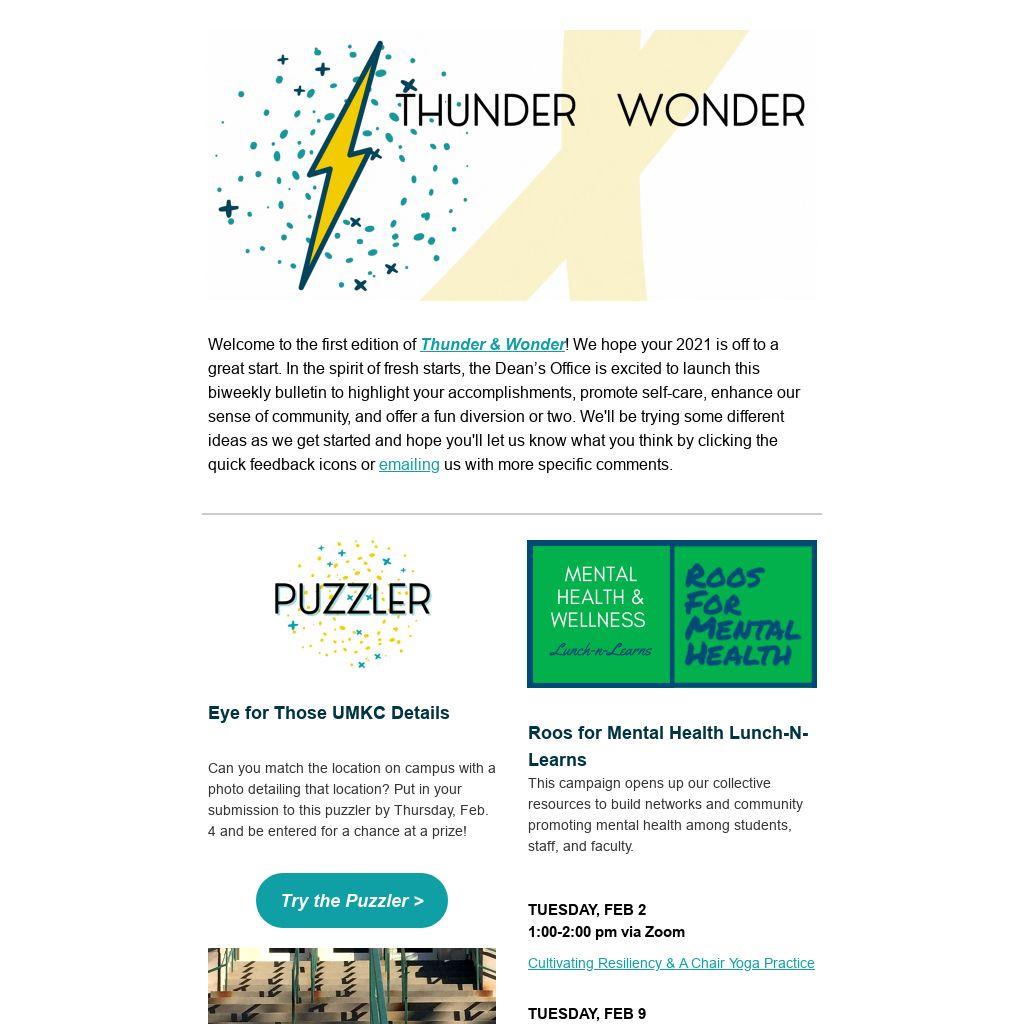 Welcome to the first edition of Thunder & Wonder! We hope your 2021 is off to a great start. In the spirit of fresh starts, the Dean’s Office is excited to launch this biweekly bulletin to highlight your accomplishments, promote self-care, enhance our sense of community, and offer a fun diversion or two. We'll be trying some different ideas as we get started and hope you'll let us know what you think by clicking the quick feedback icons or emailing us with more specific comments.