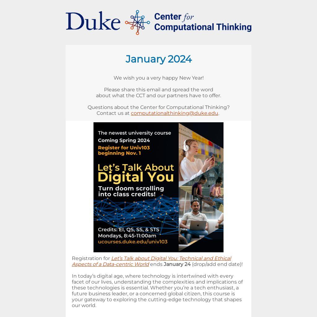 You're receiving this email because you participated in a Duke +DataScience learning experience or have expressed interest in the CCT.