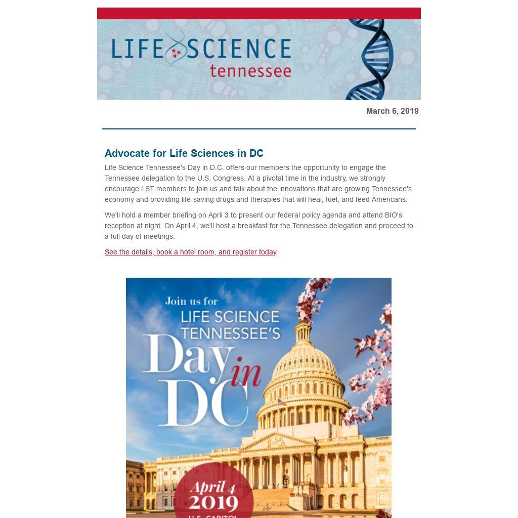 Advocate for Life Sciences in DCLife Science Tennessee's Day in D.C. offers our members the opportunity to engage the Tennessee delegation to the U.S. Congress. At a pivotal time in the industry, we strongly encourage LST members to join us and talk about the innovations that are growing Tennessee's economy and providing life-saving drugs and therapies that will heal, fuel, and feed Americans. We'll hold a member briefing on April 3 to present our federal policy agenda and attend BIO's reception at night. On April 4, we'll host a breakfast for the Tennessee delegation and proceed to a full day of meetings.
