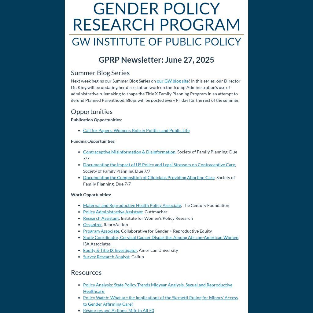 Next week begins our Summer Blog Series on our GW blog site! In this series, our Director Dr. King will be updating her dissertation work on the Trump Administration's use of administrative rulemaking to shape the Title X Family Planning Program in an attempt to defund Planned Parenthood. Blogs will be posted every Friday for the rest of the summer.