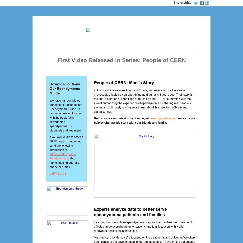The project is an online survey for adult and pediatric ependymoma patients and the parents of pediatric patients. It focuses on quality of life questions to help researchers learn what life is like for people with ependymoma before, during and after treatment. The project is led by CERN member, Terri Armstrong, Ph.D., and is in its fourth year. To date, 280 adults and 79 kids and their parents have participated.