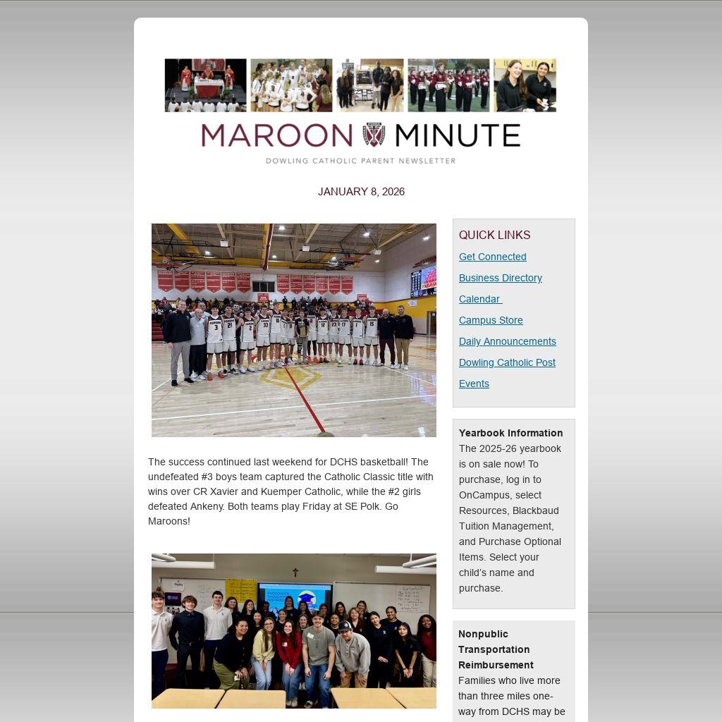 The success continued last weekend for DCHS basketball! The undefeated #3 boys team captured the Catholic Classic title with wins over CR Xavier and Kuemper Catholic, while the #2 girls defeated Ankeny. Both teams play Friday at SE Polk. Go Maroons!
