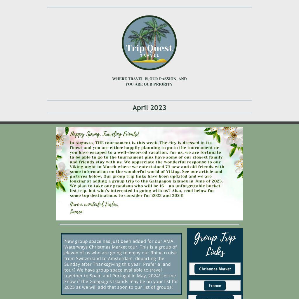 I am Lauren Williams, owner of Trip Quest Travel Services for the past seven years. Moving from three decades in education to becoming a travel consultant has caused me to shift from “The Doctor of Education” to “The Doctor of Travel.” My clients are often just like me – they want a rejuvenating vacation that teaches them about the world and the cultures around them. I love beautiful scenery, exploring new places, and learning something new every day! Aside from travel, I stay busy with my husband, Steve, and our four children and thirteen grandchildren. Being active in the church and in our community feeds our souls as well. I love to play pickleball and bridge when I am not helping clients plan that perfect trip! Because our world is so much smaller now, I am happy to work with clients wherever they might live…but by referral only. Let me know if you have friends or family who would like to added to my monthly newsletter list! Also, let me know if there is something you’d like to know more about!