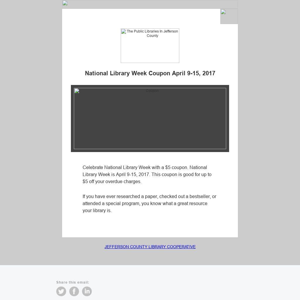 Celebrate National Library Week with a $5 coupon. National Library Week is April 9-15, 2017. This coupon is good for up to $5 off your overdue charges.