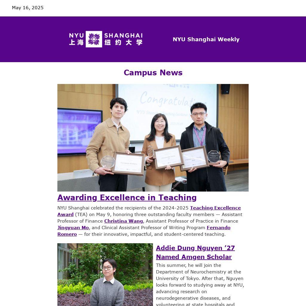NYU Shanghai celebrated the recipients of the 2024-2025 Teaching Excellence Award (TEA) on May 9, honoring three outstanding faculty members — Assistant Professor of Finance Christina Wang, Assistant Professor of Practice in Finance Jingyuan Mo, and Clinical Assistant Professor of Writing Program Fernando Romero — for their innovative, impactful, and student-centered teaching.